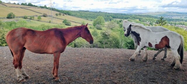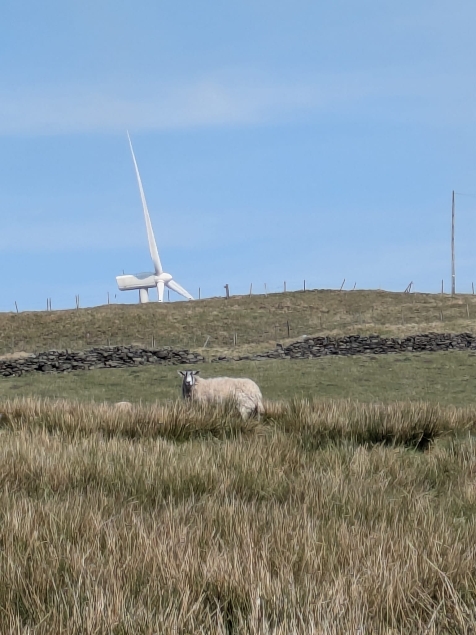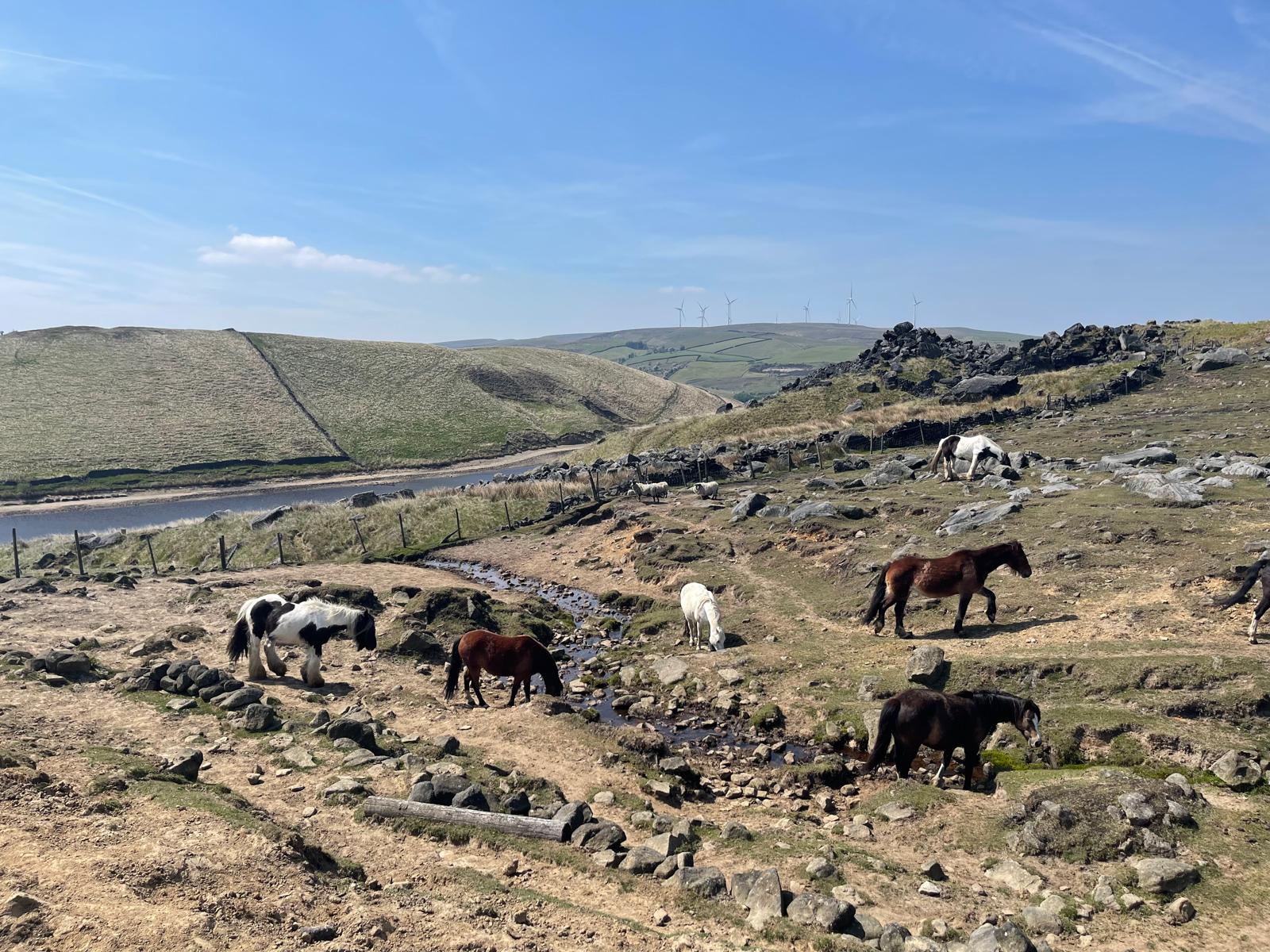 One of those wall to wall spring sunshine days, perfect for our 9 mile ramble over the moors around Scammonden starting with a semi circuit of Scammonden reservoir then ascending to Slaithwaite moor with excellent views across to Meltham Moor and Linthwaite in the valley- we passed unusual named places like Wham farm and had a close encounter with some inquisitive frisky horses before returning over the hill and back down to Scammonden