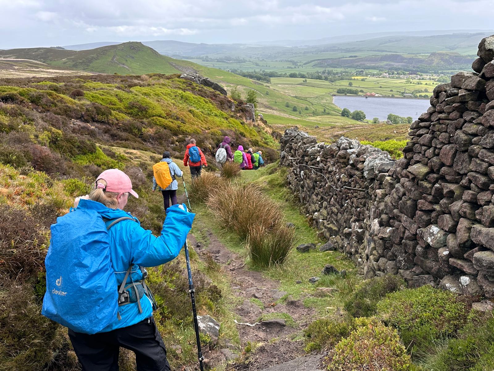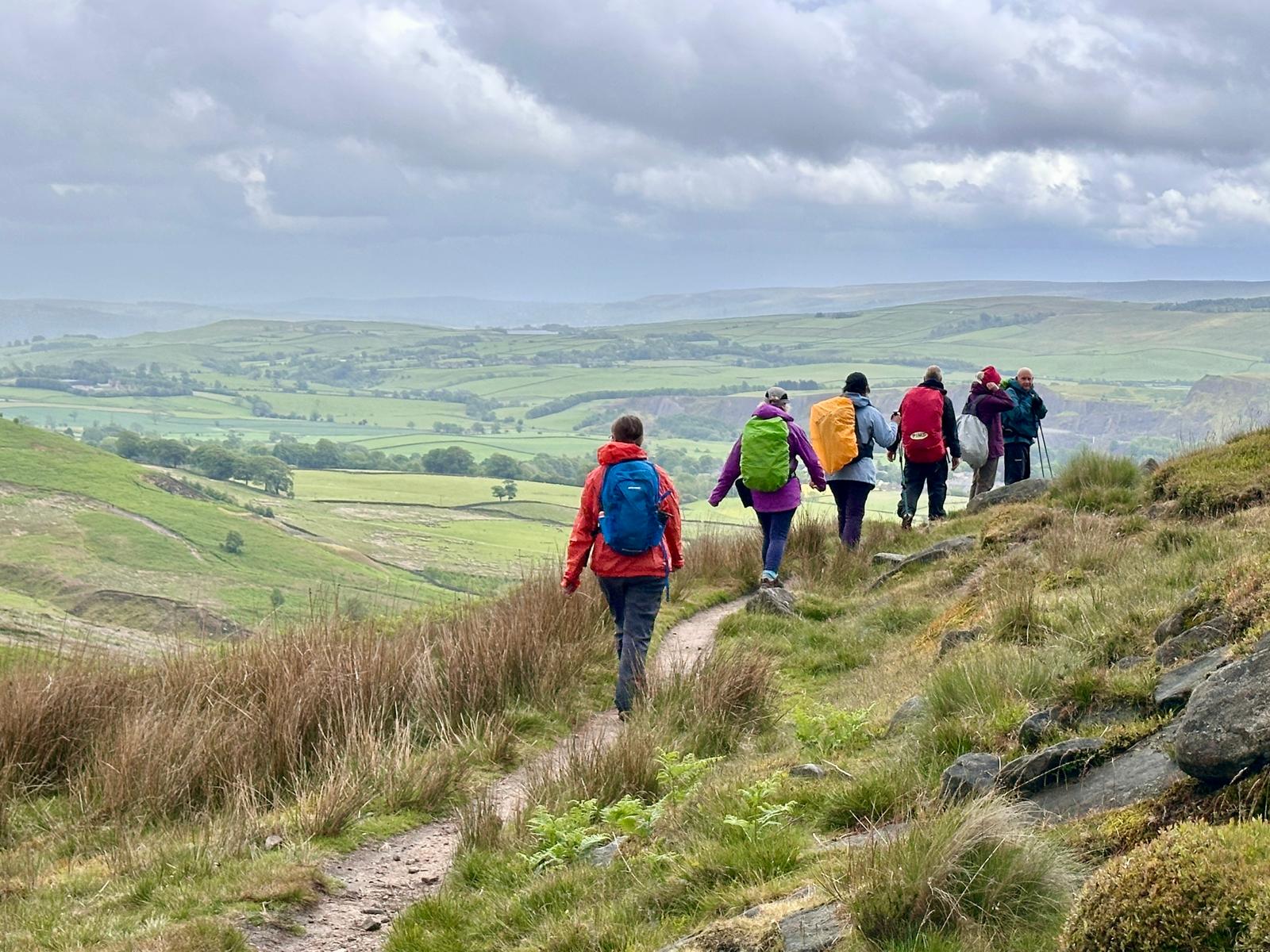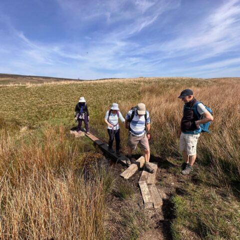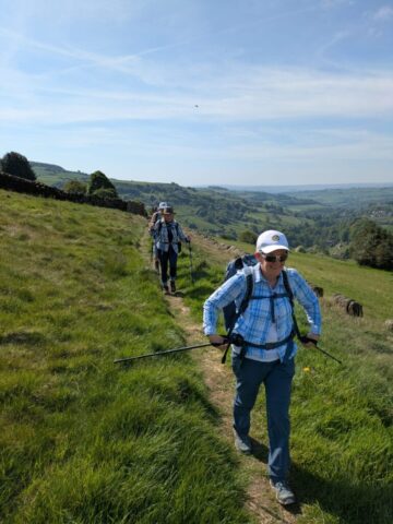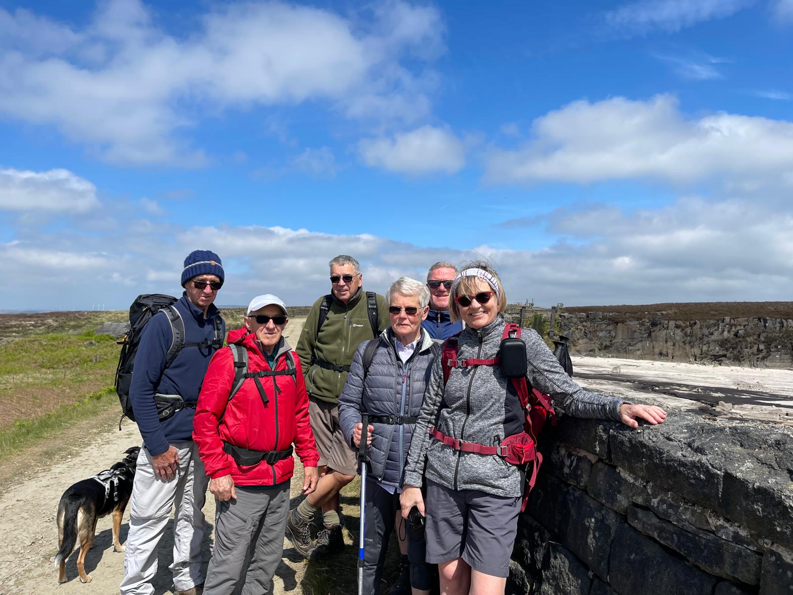 There was a famous mass trespass of Kinder scout in the 1930s, followed by another mass trespass of Morley walking club on Sunday…9 walkers travelled to the dark peak area on a sunny and warm day to complete the historical Kinder Trespass route of the 1930s- we ascended Kinder Scout with excellent long range views of countryside, Manchester City skyline in the distance with passing planes overhead which we could follow each then landing at Manchester Airport.After a lunch stop perched on the edge of the top, we continued along the ridge before descending-initially quite steep followed by meadow paths then a final short riverside stretch rewarded by an ice cream stop at the end