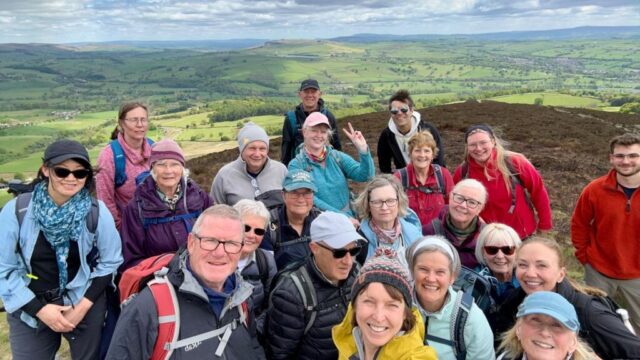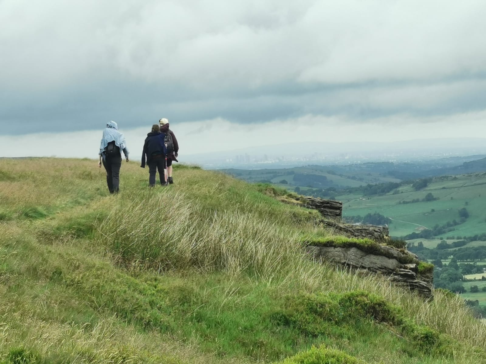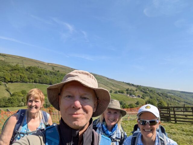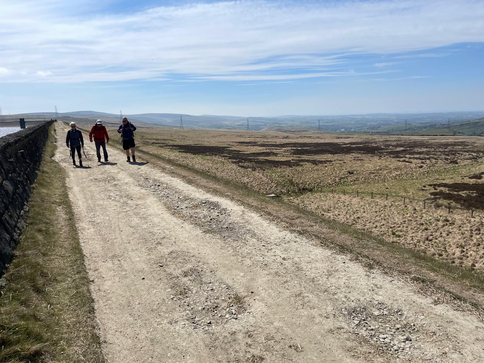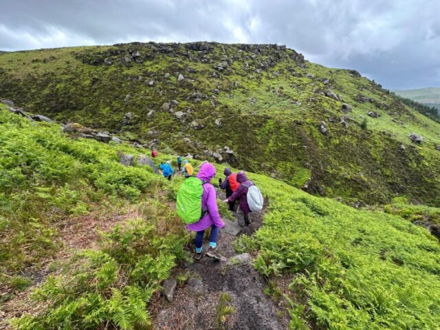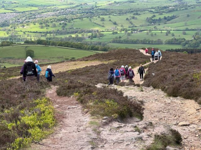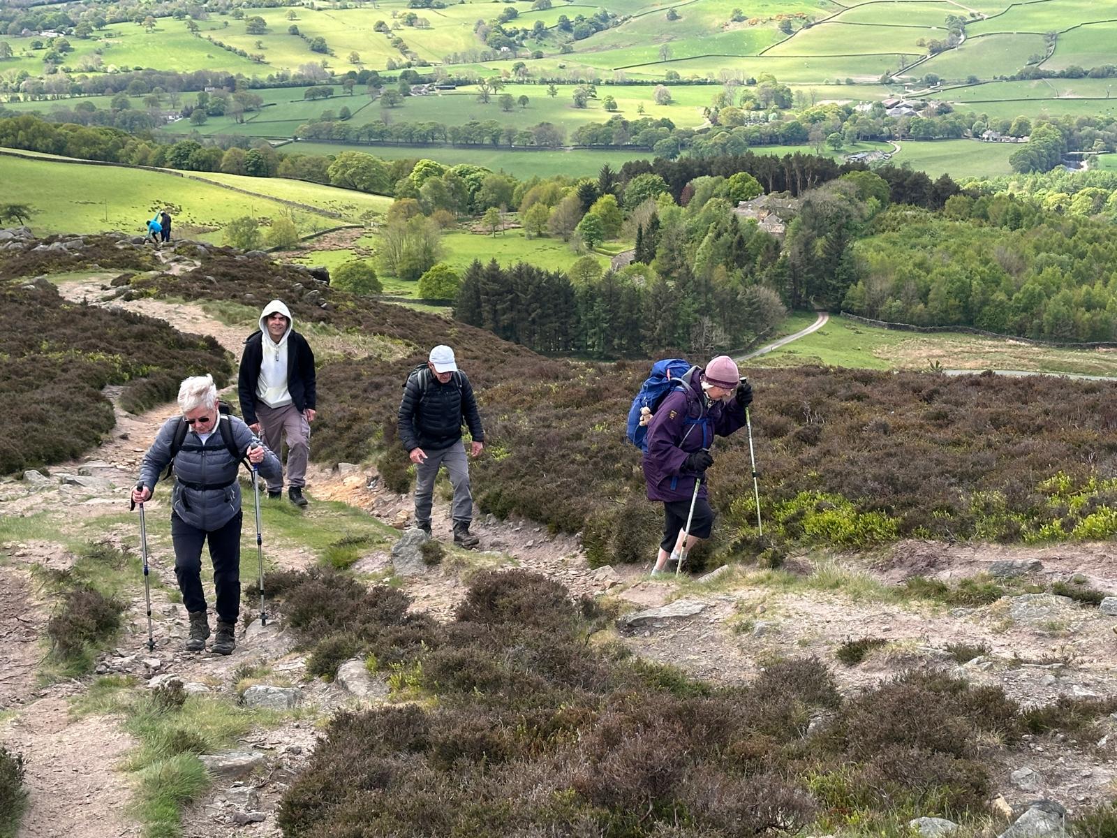 There was a famous mass trespass of Kinder scout in the 1930s, followed by another mass trespass of Morley walking club on Sunday…9 walkers travelled to the dark peak area on a sunny and warm day to complete the historical Kinder Trespass route of the 1930s- we ascended Kinder Scout with excellent long range views of countryside, Manchester City skyline in the distance with passing planes overhead which we could follow each then landing at Manchester Airport.After a lunch stop perched on the edge of the top, we continued along the ridge before descending-initially quite steep followed by meadow paths then a final short riverside stretch rewarded by an ice cream stop at the end