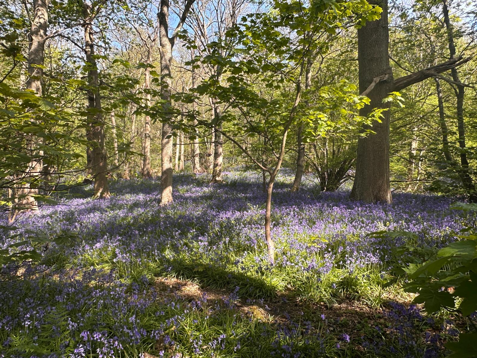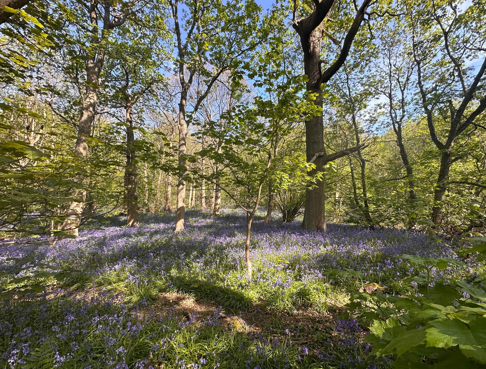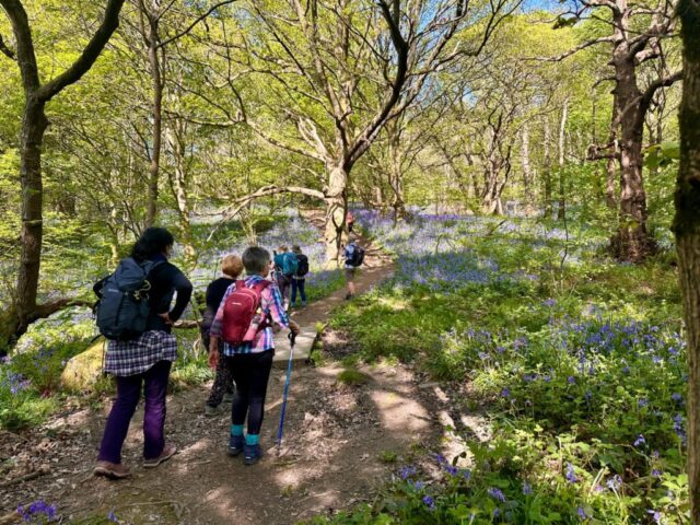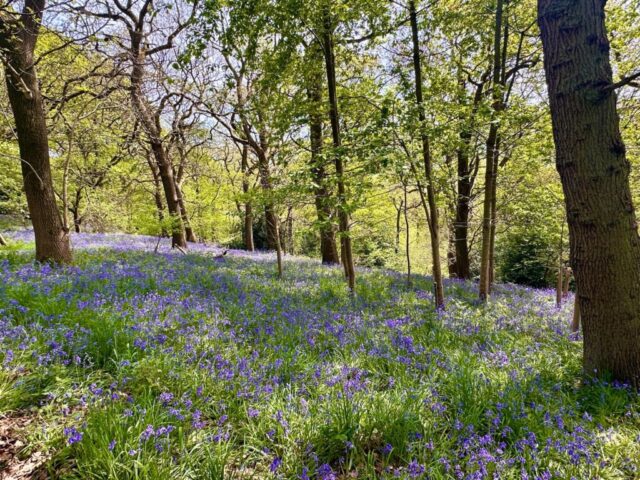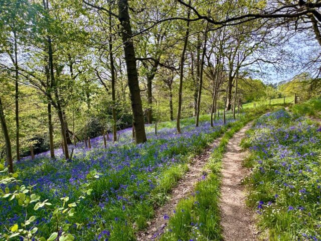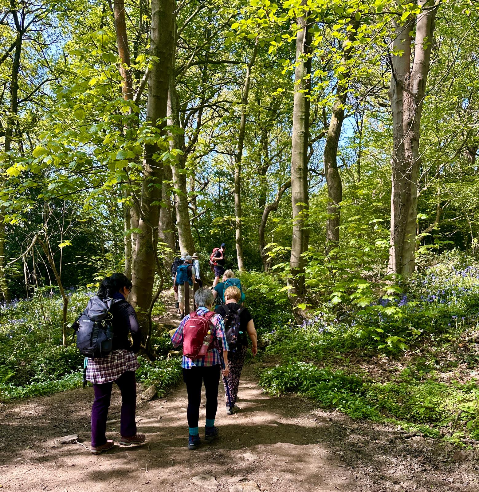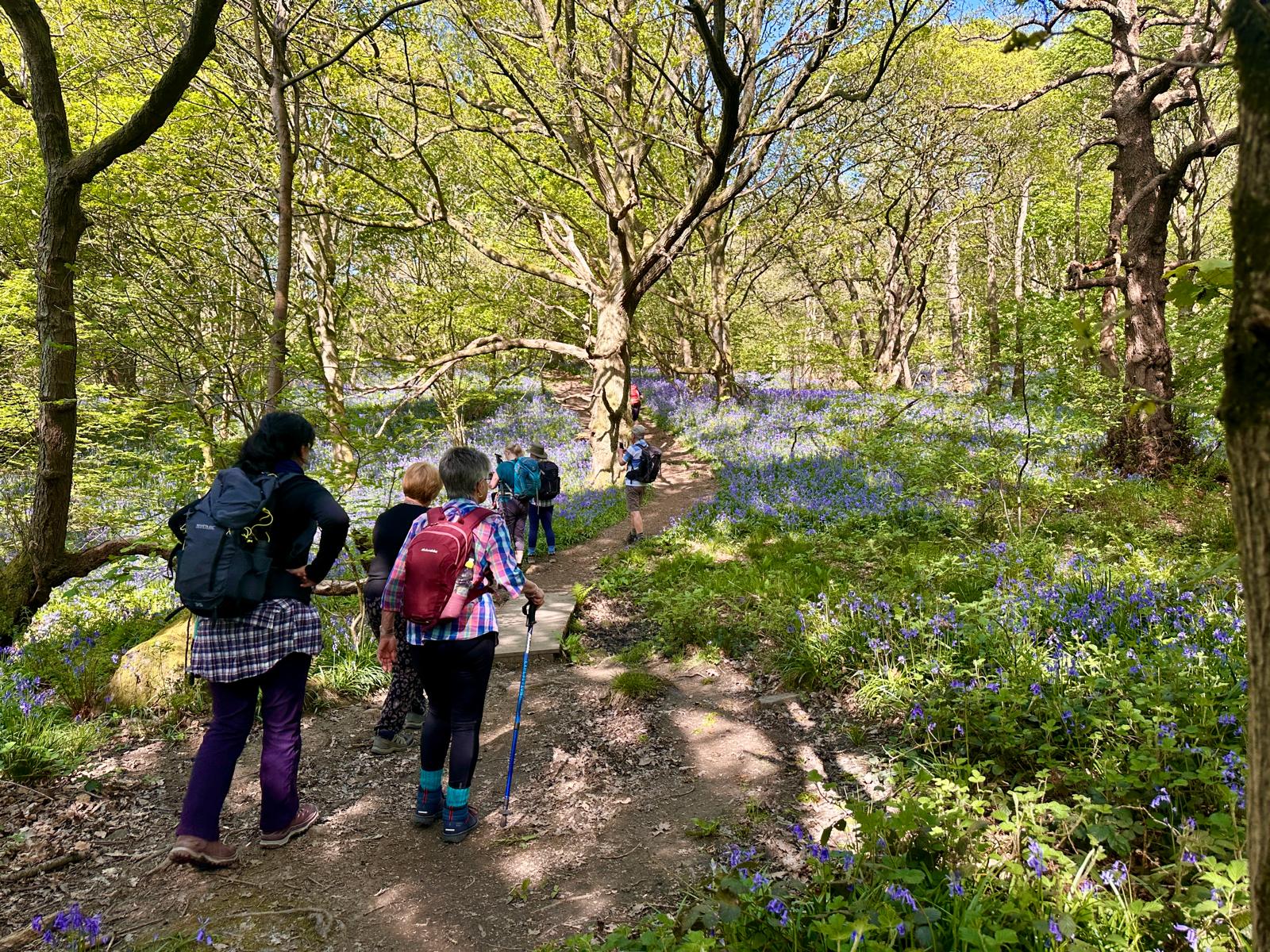 Another hot and sunny day… we started our walk on footpaths through a carpet of bluebells in Middleton Woods before ascending to Middleton Moor where we had good long range views and wall to wall sunshine-we then descended finding some partial shade for a lunch stop-after lunch we went thorugh a further bluebell wood then a stroll down millionaire’s row to the river Wharfe and back into Ilkley where an ice cream mobile parlour was conveniently waiting near the end of our route